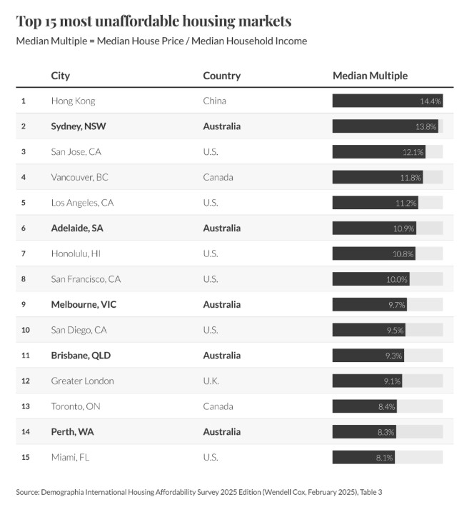 Sydney’s median house price is now 13.8 times the median household income, a level Demographia calls “impossibly unaffordable.” But the bigger surprise comes from Adelaide, where affordability has deteriorated sharply. Once known as Australia’s “affordable capital,” Adelaide now ranks second least affordable in the country, with a price-to-income ratio of 10.9, surpassing Melbourne (9.7) and Brisbane (9.3).